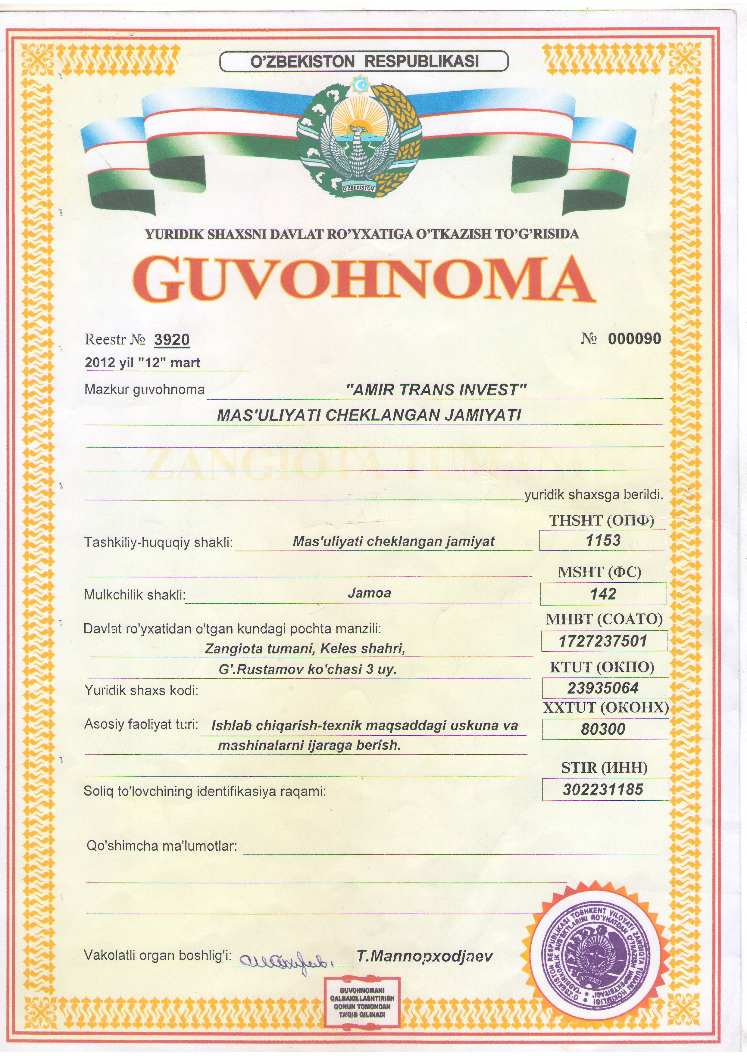 AMIR TRANS INVEST LLC is a member of the Chamber of Commerce and Industry of Uzbekistan. Certificate